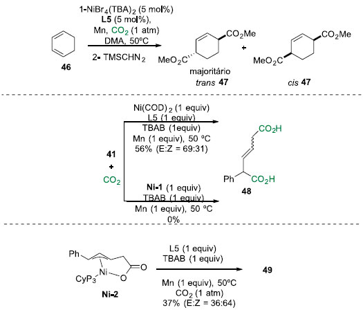 ![]() Esquema 13. Experimentos mecanísticos para a reaçao de carboxilaçao 1,4 de 1,3-dienos catalisadas por níquel