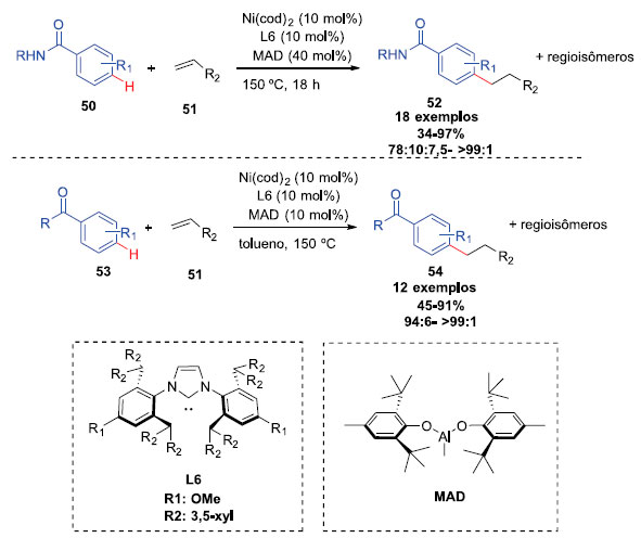 Em seguida, foram feitos estudos sobre o mecanismo da reaçao (Esquema 13). Primeiramente, foi feito a análise da estereoquímica de 46 com CO2. Trans-47 é preferencialmente formado do que cis-47, sugerindo que o segundo CO2 é inserido no π-alil complexo I por um ataque pela face oposta. Porém, essa interpretaçao nao exclui a rápida interconversao dos complexos π-alil sobre a exposiçao de Ni(0)(L5), anterior a inserçao de CO2. Ao analisar o complexo Ni-1, é possível observar que sua reatividade com 41 nao é comparável ao com Ni(COD)2/L5, pois nao é observado nem mesmo traços de 48. O Ni-2 gerou apenas 48 na presença L5 e Mn. Esses resultados sugerem que o processo de transferência de um elétron (SET) funciona através das espécies de Ni(I).20 Reaçoes de ativaçao C-H As reaçoes de acoplamento catalisadas por níquel também podem ser particularmente úteis em metodologias de ativaçao C-H. Ainda que alguns exemplos mostraram a mediaçao por níquel em ativaçoes C-H em 1963, desenvolvimentos catalíticos dessa metodologia vêm sendo publicados mais recentemente.21 Nakao e colaboradores, em 2016, desenvolveram um novo método para a alquilaçao seletiva de benzamidas, e na posiçao para de cetonas aromáticas, através de uma catálise cooperativa dentre níquel e alumínio. Foi utilizado um sistema co-catalítico volumoso, o MAD (2,6-t-Bu2-4-Me-C6H2O)2AlMe, que permitiu reaçoes entre alcenos e benzamidas ou cetonas para a formaçao dos correspondentes produtos para alquilados. Diversos produtos puderam ser obtidos utilizando a metodologia com rendimentos que variaram entre 34 e 97% e com seletividade entre 78:10:7,5 e >99:1 (Esquema 14).22