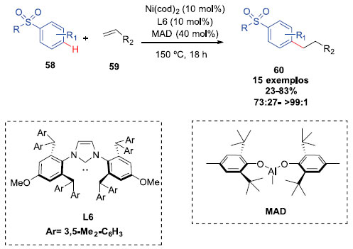 ![]() Esquema 16. Alquilaçao de sulfonil arenos com alcenos por catálise cooperativa entre Ni/ Al