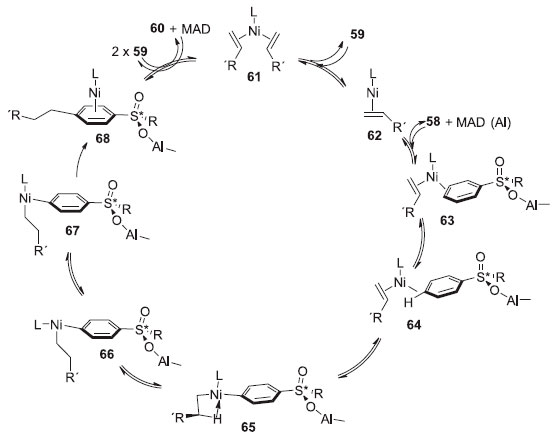 Foi proposto um ciclo catalítico para a reaçao que corrobora com os cálculos DFT obtidos no trabalho anterior (Esquema 17). Assim, o complexo bis(alceno)níquel(0) 61 troca de ligante com o aduto sulfonil areno/MAD para formar o complexo 64 através do Ni(0)-ligado-ao-alceno 62 e o complexo-π 63. A ligaçao C-H é clivada e o complexo alquil-Ni(II)-aril 65 é formado através de uma transferência de hidrogênio concertada. Uma isomerizaçao geométrica gera o complexo de Ni(II) 67 em forma de T através de seu isômero 66, antes da eliminaçao redutiva, que entao gera a ligaçao C-C. O catalisador de alumínio tem como funçao chave a aceleraçao e o regiocontrole da etapa da ativaçao C-H.23