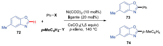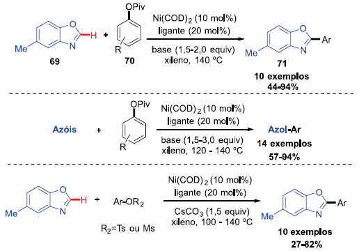 O grupo de Kayani reportou uma investigaçao sistemática de arilaçao C-H de oxazóis e benzoxazóis catalisadas por níquel, em relaçao a influência eletrônica, estérea e a variaçao do grupo de saída dos eletrófilos fenólicos. O acoplamento do 5-metil benzoxazol com diferentes pivalatos foi explorado primeiramente. Os produtos foram obtidos com rendimentos que variaram entre 44-94% (Esquema 18), sendo que o rendimento mais baixo foi para o produto mais impedido estericamente, o orto-metilfenil pivalato. Um segundo escopo de pivalatos com diversos azóis foi investigado. Essa transformaçao se mostrou compatível com éteres, fluoretos, grupos trifluorometil e alquil benzílicos. O efeito eletrônico se mostrou significativo, como por exemplo, em substratos neutros e ricos em elétrons, que conduziram aos produtos em baixos rendimentos. Os produtos desse escopo foram obtidos com rendimentos entre 57 e 94%. Em seguida foi explorado o acoplamento de azóis com tosilatos e mesilatos. O acoplamento de 5-metil benzoxazol com diversos tosilatos resultou em produtos com baixos rendimentos, quando comparados com o correspondente pivalato (entre 27 e 70%). Rendimentos um pouco melhores foram observados para os mesilatos (entre 30 e 82%). Um escopo utilizando arilaçao de carbamatos também foi demonstrado onde rendimentos entre 22 e 83% foram obtidos.24
