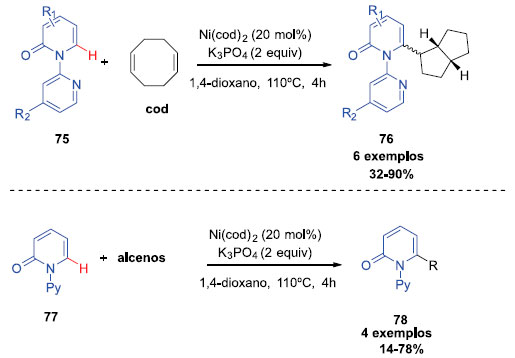 Miura e colaboradores desenvolveram uma alquilaçao C-H seletiva de 2-piridonas catalisadas por níquel. Após obter as melhores condiçoes reacionais, foi investigado o escopo de 2-piridonas (Esquema 20). A presença de grupos retiradores de elétrons, como CF3 na posiçao C3 e C4 foram toleradas, e os produtos foram obtidos com bons rendimentos. Piridonas contendo substituintes com grupos doadores de elétrons apresentaram reatividade moderada. O método foi um pouco sensível a fatores estéreos, e os substituintes no C5 das piridonas nao acoplaram com o COD. As piridonas halogenadas foram substratos relutantes, e uma pequena, mas significativa, quantidade de piridonas dehalogenados foi detectada por causa da competitiva da adiçao oxidativa da ligaçao halogênio-C em relaçao a baixa valência do centro do níquel. Os produtos foram obtidos com rendimentos que variaram entre 32 e 90%. A reatividade de alguns alcenos também foi investigada (Esquema 20). O 1,3-dieno e o 1,6-dieno contendo metilenos foram testados, assim como alcenos simples terminais, mas nenhum produto de acoplamento foi detectado.25