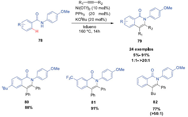 Porém, em 2017, Chatani desenvolveu um novo modelo, onde o uso de uma base forte seria capaz de desprotonar a amida, gerando um ânion que facilmente reagiria com o catalisador de níquel, produzindo uma nova ligaçao entre N e Ni, sem a necessidade de um N(sp2). A reaçao foi testada entre amidas e difenilacetilenos, utilizando diferentes condiçoes, e pode-se confirmar que o uso de bases fortes foi eficiente. Após obter as condiçoes otimizadas, o efeito dos substituintes no nitrogênio foi também examinado. Grupos arilas contendo grupos retiradores ou doadores de elétrons geraram as correspondentes isoquinolinas com altos rendimentos, porém o uso de grupos alquilas produziram os produtos com baixos rendimentos. Em seguida, o escopo de substratos dessa reaçao de anulaçao oxidativa foi avaliado em relaçao as amidas (Esquema 23). Diversos grupos funcionais nos substratos se mostraram tolerantes a metodologia, gerando produtos com rendimentos que variaram entre 32 a 91%. Diferentes alcinos também foram utilizados, e rendimentos entre <5% e 77% foram obtidos através de uma mistura de regioisômeros que variou entre 3:1 até a obtençao de apenas um isômero.28