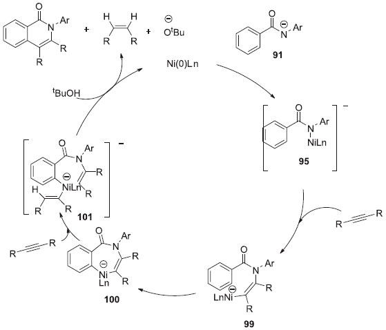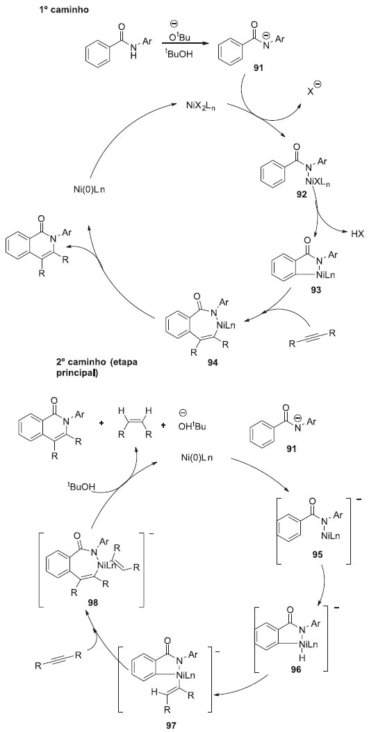Com intuito de determinar o mecanismo, experimentos controle foram executados, como a reaçao com marcaçao isotópica de deutério, que nao foi possível observar troca de H/D no produto e na amida recuperada. Assim, conclui-se que a clivagem da ligaçao C-H é irreversível. O efeito cinético isotópico de 3,7 sugeriu que a etapa de clivagem da ligaçao C-H é a etapa determinante de velocidade. Pode-se observar também que a funçao do alcino nao é de apenas componente de acoplamento, ele também é um aceptor de hidrogênio.28 De acordo com os autores, o mecanismo envolve dois caminhos (Esquema 24). O complexo de Ni(II) se inicia no primeiro caminho. Um próton é abstraído da amida pelo KOBut gerando o ânion amidato 91, que reage com Ni(II) para formar o complexo 92. A clivagem da ligaçao C-H orto gera o níquelciclo 93, seguido pela inserçao do alcino na ligaçao N-Ni, que entao sofre eliminaçao redutiva para gerar a isoquinolina e o Ni(0). O Ni(0) nao pode ser oxidado a Ni(II) sob as condiçoes reacionais empregadas. Porém, o ciclo catalítico, no qual o Ni(0) é a espécie catalítica chave, inicia-se no caminho 2. O ânion amidato 91, reage com Ni(0) gerando o complexo de níquel 95, o qual é suficientemente reativo para sofrer adiçao oxidativa, gerando espécies de hidreto de níquel 96, pois o complexo é suficientemente rico em elétrons. A inserçao excessiva de alcinos nas ligaçoes H-Ni e C-Ni geram o complexo 98. A eliminaçao redutiva, seguida pela protonaçao de tBuOH gera a isoquinolina com a regeneraçao de Ni(0) e KOBut com concomitante formaçao de alcenos. Um mecanismo alternativo (Esquema 25) seria a inserçao de um alcino na ligaçao N-Ni em 95 gerando o complexo 99. A adiçao oxidativa da ligaçao C-H orto gerando um niquelciclo de sete membros 100, o qual permite a inserçao de um alcino, levando ao complexo 101. Esse complexo sofre eliminaçao redutiva e protonaçao pelo tBuOH, gerando a isoquinolina com a regeneraçao do Ni(0) e KOBut, com a concomitante formaçao de um alceno.28