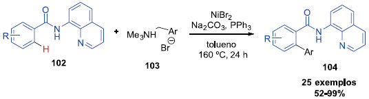 Wei e colaboradores desenvolveram um método para a clivagem de ligaçoes sp2 C-H e C-N, catalisadas por níquel, na reaçao entre amidas aromáticas contendo 8- aminoquinolinas com sais de amônio benzílico. Após otimizar as condiçoes reacionais, uma varredura do contra ânion foi investigada. Foi observado que o uso de iodeto e cloreto geravam produtos com rendimentos mais baixos, enquanto o uso de triflato e hexafluorfosfato nao conduzia ao produto (Esquema 26). Em seguida, um escopo de substratos de carboxamidas foi avaliado com o uso de diferentes 8-aminoquinolinas benzamidinas. Os produtos foram obtidos com rendimentos que variaram entre 58 e 94%. As reaçoes foram mais sensíveis a fatores estéreos. O escopo de sais de amônio benzílicos também foi avaliado e tanto os substratos contendo grupos doadores de elétrons quanto os substratos contendo grupos retirados de elétrons toleraram o método. Os produtos foram obtidos rendimentos entre 81 e 99%. Apenas na presença do nitro o rendimento foi moderado, com apenas 52%.29