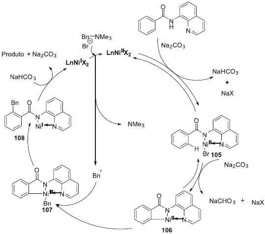 Reaçoes controle foram executadas a fim de investigar o mecanismo, utilizando marcaçao isotópica com deutério. Foi observado que uma significativa quantidade de troca H/D foi obtida, porém apenas na ligaçao C-H orto da amida recuperada, indicando, dessa forma, que a clivagem da ligaçao C-H é reversível. Um efeito isotópico cinético de 1,6 foi obtido, sugerindo que a clivagem da ligaçao C-H nao está envolvida na etapa determinante de velocidade. Reaçoes envolvendo captura de radicais também foram executadas e concluiu-se a presença desses no meio. Diante dos experimentos controle, o mecanismo exposto no Esquema 27 foi sugerido. A coordenaçao da amida com Ni seguida pela troca de ligantes gera o Ni(II) contido no complexo 105. A cicloniquelaçao desse intermediário via ativaçao C-H forma o complexo de Ni(II) 106, que é oxidado ao complexo de Ni(III) 107 por um radical benzílico. A eliminaçao redutiva do intermediário 107 seguida pela protonaçao gera o produto desejado e espécies de Ni(I) com sais de amônio benzílico. O tratamento das espécies de Ni(I) com os sais de amônio benzílico produzem radicais benzil e espécies de Ni(II).29