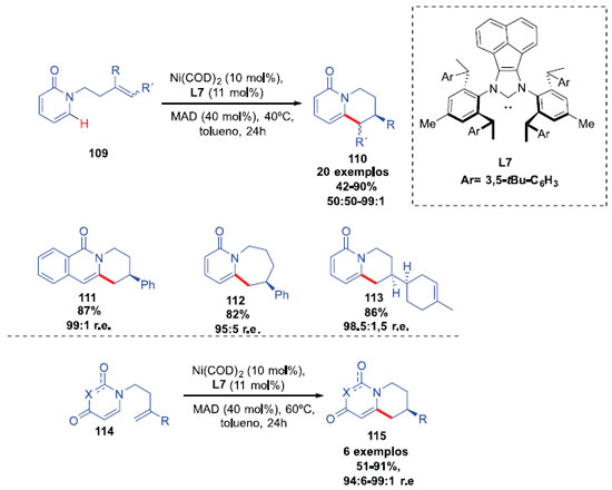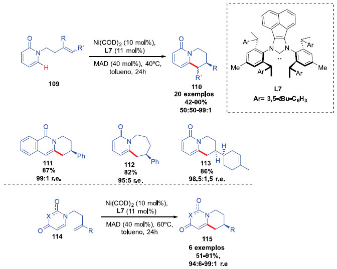 Recentemente, Cramer e colaboradores reportaram uma classe de carbenos N-heterociclos (NHCs) quirais, com o objetivo de substituir o ligante IPr e demonstrar seu potencial na funcionalizaçao C-H enantiosseletiva de piridonas catalisadas por níquel(0). Após otimizar os parâmetros reacionais, diversas 2-piridonas foram testadas (Esquema 29). Diversos grupos alquila e substituintes aromáticos R foram testados. Produtos com grupos doadores e retiradores de elétrons, assim como estericamente mais impedidos, como grupos toluil na posiçao orto puderam ser obtidos, com pouca influência na performance da reaçao. Rendimentos que variaram entre 42 e 90% e razao enantiomérica de 50:50 até 99:1 foram obtidos. Derivados de uracila também foram testados nas condiçoes da metodologia e reagiram com a mesma eficiência, gerando produtos com excelentes rendimentos e enantiosseletividades. 4-Piridonas também foram exploradas, gerando produtos com rendimentos entre 51-91% e 94:6-99:1 r.e.30
