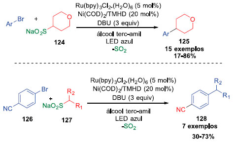 O grupo de Helal desenvolveu a primeira reaçao desulfinativa metalafotoredox de acoplamento Csp2-Csp3 entre sais de sulfinato de alquila e haletos de arila catalisada por Ni/Ru. Foi idealizado que os sais de sulfinato de alquila poderiam servir como radicais precursores nas reaçoes metalofotoredox. Acreditou-se que o ciclo catalítico poderia ser gerado através de um radical alquila intermediário, pela oxidaçao do sal sulfinato, que é obtido pela oxidaçao de apenas um elétron (SET) do seu respectivo sal, através da excitaçao do estado tripleto do fotocatalisador [PCn]*, seguido pela liberaçao de SO2. A subsequente geraçao do radical alquila poderia interceptar o ciclo catalisado por Ni, seguindo o mecanismo proposto por Molander e Kozlowski.38 O escopo de substratos com diferentes haletos de arila foram testados levando a produtos farmaceuticamente importantes com rendimentos que variaram entre 17 e 86% (Esquema 32). Um escopo com diferentes sais de sulfinatos também foram explorados e produtos com rendimentos que variaram entre 30 e 73% puderam ser isolados.38