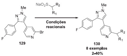 Após o sucesso na avaliaçao de substratos, o método foi testado na síntese de um intermediário útil para a rota sintética de um fármaco (Esquema 33). O composto 129 foi utilizado para a síntese de um inibidor seletivo ATP-competitivo da caseína quinase 1δ, que está associada com a regulaçao do ritmo circadiano. Os produtos foram obtidos com rendimentos que variaram entre 2 e 40%.