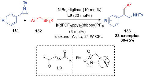 Chen e colaboradores reportaram uma metodologia nova para o acoplamento cruzado de aziridinas e alquiltrifluoroborato de potássio catalisados pelo sistema duplo fotocatalisadores/níquel. O protocolo requer uma abordagem branda para a síntese de aminas β-substítuidas. Após estabelecer as condiçoes reacionais otimizadas, um escopo de substratos de aziridinas foi avaliado (Esquema 34). O sistema de dupla catálise se mostrou eficiente e compatível para diversos grupos funcionais. Produtos com rendimentos entre moderados e bons puderam ser obtidos (entre 30 e 71%). Diversos trifluoroboratos de alquila também foram testados e os produtos desejados puderam ser obtidos com rendimentos que variaram entre 36 e 75%. Para demonstrar o potencial sintético do protocolo, uma aplicaçao em fluxo contínuo foi realizada e apresentou bom desempenho, com eficiência de 58% de rendimento. Essa descoberta também implicou que o processo de fotoreaçao poderia ser a etapa determinante de velocidade.39