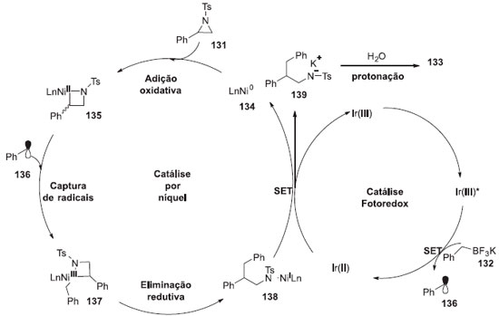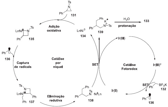 Um mecanismo plausível foi proposto como está demonstrado no Esquema 35. Primeiro, o catalisador de Ni(0) 134, formado in situ pelo pre-catalisador de Ni(II), sofre uma inserçao oxidativa, na ligaçao C-N mais volumosa da aziridina 131, proporcionando o azaniquelciclobutano 135. A regiosseletividade pode ser atribuída as diferentes propriedades eletrônicas na deficiência de elétrons do ligante. Enquanto isso, 109 é convertido ao radical benzílico 136, para gerar o estado fotoexcitado do Ir(III)*, através da transferência de um único elétron no processo de oxidaçao. Assim, as espécies de Ni(II) sao rapidamente capturadas pelo radical benzílico 136, gerando o intermediário alquilníquel(III) 137. A eliminaçao redutiva do intermediário 137 gera as espécies de Ni(I) 138, que sofrem outra reduçao pela transferência de um único elétron através da forma reduzida do fotocatalisador de Ir(II). Esse processo fornece o produto 133 pela protonaçao do intermediário 139, com liberaçao do fotocatalisador de Ir(III), fechando assim, os dois ciclos catalíticos.39