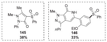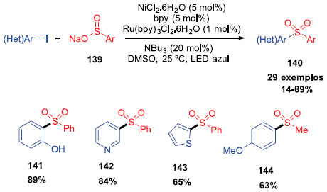 O grupo de Monolikakes reportou a síntese de sulfonas por sulfinatos de sódio ou lítio e iodetos de arilas catalisadas pelo sistema duplo de fotocatalisador e níquel. Diversos sulfinatos de sódio foram testados com diferentes iodetos de arila e heteroarila (Esquema 36). Produtos contendo grupos retirados de elétrons e doadores de elétrons puderam ser obtidos, assim como em diferentes posiçoes do anel aromático, com rendimentos que variaram entre 14 e 89%. A metodologia foi ainda testada na última etapa da síntese de drogas, como fenazona 145 e sildenafil 146, levando aos produtos com 38 e 33% de rendimento, respectivamente (Figura 3). Para expandir o método, reaçoes com sulfinatos de lítio foram utilizados e geraram os produtos correspondentes com bons rendimentos. 40