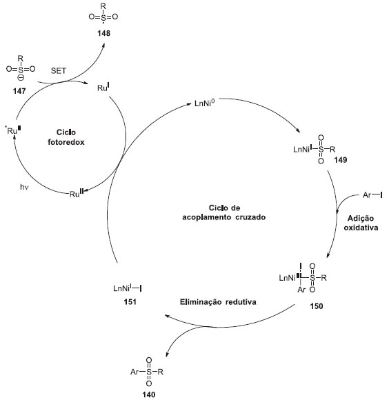 Experimentos controle levaram a propor o ciclo catalítico demonstrado no Esquema 37. A irradiaçao do fotocatalisador de RuII gera o estado excitado de *RuII. A oxidaçao da transferência de um único elétron do sulfinato 147 conduz ao radical sulfonil 148 e o complexo de RuI. A adiçao do radical sulfonil 148 para o catalisador de Ni fornece o intermediário de NiI 149, que pode sofrer adiçao oxidativa ao iodeto de arila. O complexo de NiIII 150 sofre eliminaçao redutiva, gerando o produto sulfona 140 e espécies de NiI-I 151. A reduçao da transferência de um único elétron de 151 pelo RuI produz o catalisador de Ni0 com o complexo de RuII no estado fundamental, fechando o ciclo fotocatalisadores e o acoplamento cruzado. A funçao da amina nao foi totalmente esclarecida, sugere-se uma possível mediaçao na transferência de elétron entre os dois ciclos, evitando uma eventual degradaçao do sulfinato.40