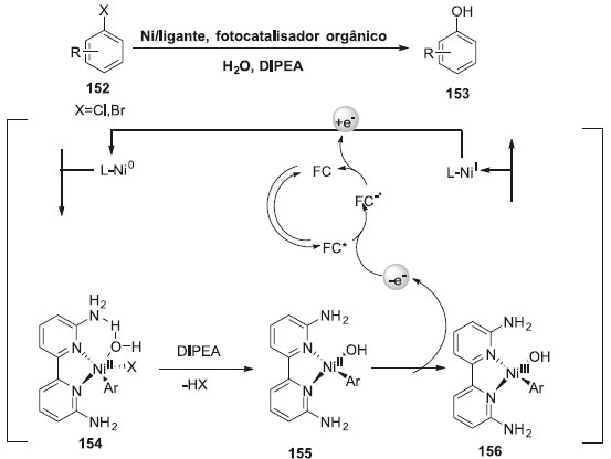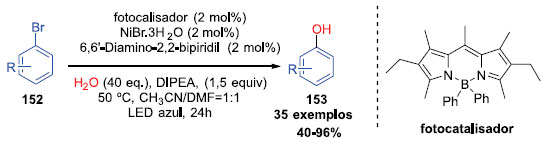 Uma metodologia de hidroxilaçao de haletos de arila com água catalisada por um sistema duplo fotocatalisadores/níquel foi desenvolvido pelo grupo de Xue (Esquema 38). Apenas produtos monosubstituídos foram observados, demonstrando assim, um alto grau de quimiosseletividade para essa reaçao. Diversos produtos importantes, como intermediários de compostos bioativos puderam ser obtidos com rendimentos entre 40 e 96% (Esquema 39). O escopo foi ainda expandido para substratos de menor custo, porém mais desafiadores, como os cloretos de arila. Devido à forte ligaçao C-Cl, nao era esperado que a reaçao ocorresse sob as mesmas condiçoes, porém ao aumentarem a temperatura, a reaçao ocorreu e gerou produtos com rendimentos entre 45 e 91%.41