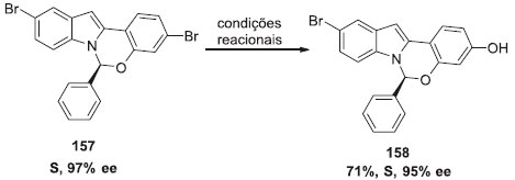 Com intuito de demonstrar a utilidade do método, um intermediário chave do Elbasvir, um fármaco utilizado para o tratamento contra Hepatite C, foi sintetizado com um rendimento de 71%, com uma pequena perda da enantiosseletividade (Esquema 40). Outra molécula mais complexa também foi testada e gerou o produto com 62% de rendimento. A metodologia foi realizada em escala maior (10 mmol), gerando o produto com 92%. Para analisar se o OH dos produtos fenólicos vem originalmente da água, reaçoes foram carreadas com H2O18. Os produtos foram obtidos com o O18 demarcados isotopicamente, demonstrando assim que o OH realmente é oriundo da água.41