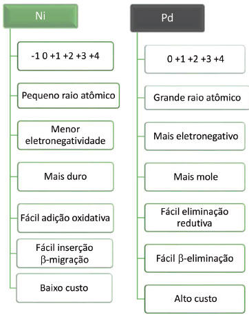 Além disso, o preço do NiCl2 é de 0,376 reais mmol-16, enquanto o PdCl2 é de 21,784 reais/mmol6 e o de PtCl2 é de 120,937 reais mmol-1 6.2 O níquel também tem um pequeno raio atômico7 de 1,24 Å, enquanto o do paládio é de 1,39 Å, e o comprimento da ligaçao8 Ni-ligante é relativamente curto quando comparada com a do Pd-ligante, por exemplo, C-Ni é de 1,82 Å, enquanto a C-Pd é de 2,27 Å (Figura 2). Diante de todas essas características, os pesquisadores têm desenvolvido diversas novas reaçoes envolvendo a catálise com níquel. Esse artigo de revisao abordará apenas alguns exemplos recentes (ente 2016 e 2018) relacionados a catálise por níquel em reaçoes de ativaçao C-H, carboxilaçao, carbonilaçao e sistemas de catálise dupla entre Ni/fotocatalisadores, por serem assuntos atuais, que podem contribuir de maneira positiva para a sociedade química.