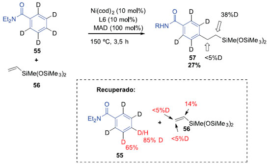 Reaçoes para determinar a velocidade inicial da reaçao foram medidas por análise cromatográfica a gás e proporcionou o valor de 3,7 para o efeito isotópico cinético. A reaçao entre 55 e 56 resultou na perda de deutério, exclusivamente na posiçao para de 50 e parcial inserçao de deutério da posiçao a de 56 (Esquema 15). Dessa forma, foi possível inferir a etapa determinante de velocidade e a reversibilidade da ativaçao C-H, exclusivamente da posiçao para.22