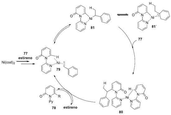 Experimentos controle com marcaçao isotópica de deutério de 77-d1 e estireno-d8 foram executados a fim de determinar o mecanismo da reaçao. De acordo com essas informaçoes, foi proposto um mecanismo como é apresentado no Esquema 21. O Ni(COD)2 inicialmente liga-se ao 77 e ao estireno para formar o complexo-σ tricoordenado de níquel 79, incluindo a ligaçao C-H da posiçao C-6 da piridona. Subsequente, ocorre a transferência concertada do próton, no qual, a ligaçao C-H é clivada, e duas ligaçoes C-Ni sao formadas. O resultante intermediário s-benzil Ni 81 está em equilíbrio com a estrutura termodinamicamente mais estável π-benzil Ni 81'. A eliminaçao redutiva produzida e a coordenaçao de outro 77 gera o complexo contendo o produto. A troca da ligaçao final com o estireno, libera a piridona alquilada 78, fechando o ciclo catalítico. Os resultados obtidos com os experimentos controle sugerem que o processo de transferência de um único próton é fácil e reversível, e a eliminaçao redutiva é etapa determinante da velocidade e é irreversível. Ao otimizar a reaçao, foi observado o uso indispensável de K3PO4. A funçao exata do K3PO4, nao é totalmente esclarecida pelos autores, mas sabe-se que funciona como ligante aniônico adicional para o Ni e acelera a etapa limitante, a eliminaçao redutiva.25