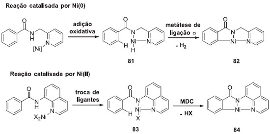 A ativaçao C-H catalisada por níquel, por um tempo, tornou-se limitada a hidrogênios ácidos. O grupo de Chatani desenvolveu um sistema bidentado quelado26 onde é possível ativar hidrogênios nao ácidos como está descrito no Esquema 22 (para simplificar o entendimento, as condiçoes e os grupos que nao estao envolvidos na etapa chave nao foram demonstrados no esquema). Porém, a presença de grupos N(sp2) e NH eram indispensáveis para a reaçao proceder. As reaçoes reportadas podem ser classificadas por dois tipos, dependendo do estado de oxidaçao da espécie catalítica chave. No caso do sistema catalisado por Ni(0), ocorre a coordenaçao do átomo de N(sp2) com o centro do Ni, seguido pela adiçao oxidativa da ligaçao N-H. Isso conduz ao complexo 82 e a clivagem da ligaçao C-H, que procede através da metátase de ligaçao σ, levando a formaçao do complexo ciclo metalado 83, com geraçao concomitante de H2. Este por sua vez, pode ser captado por um aceptor de hidrogênio, como um alcino. No sistema catalisado por Ni(II), ocorre a coordenaçao do N(sp2) com o centro do Ni, seguido pela troca de ligantes, gerando o complexo 84, o qual, após a clivagem da ligaçao C-H através do mecanismo de metalaçao-desprotonaçao concertada (MDC), gera o ciclo metalado 85. Após a formaçao dos ciclos metalados 84 e 85, diversos reagentes podem ser utilizados no restante da reaçao. Independente do mecanismo, a funçao do átomo de N(sp2) é aproximar o catalisador de níquel da ligaçao N-H através de uma coordenaçao, seguida por uma ligaçao covalente N-Ni via adiçao oxidativa ou de troca de ligantes. Os átomos de níquel nos intermediários resultantes 82 e 83, nao sao próximos o suficiente para ativar a orto ligaçao C-H, que serao, em seguida, clivadas. Dessa forma, a formaçao da ligaçao covalente N-Ni é a chave da ativaçao C-H nesse sistema de quelaçao bidentada.27