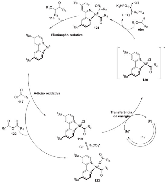 Experimentos controle foram realizados a fim de estabelecer alguns aspectos mecanísticos. A reaçao de competiçao utilizando THD/THF-d8 (1/1, v/v) como substrato, levou a uma alta fraçao do produto derivado de THF (kH/kD = 2,4), indicando que a clivagem da ligaçao α- C(sp3)-H está envolvida na etapa determinante de velocidade. Como os éteres possuem alto potencial de oxidaçao (para o THF, E = 1,75 V vs SCE), a clivagem da ligaçao α-oxi C(sp3)-H através do processo de transferência por um único elétron (SET)/desprotonaçao iniciado pela excitaçao de Ir[dF(CF3)ppy]2(dtbbpy)PF6 (E1/2*III/II = 1,21 V vs SCE em CH3CN) foi desfavorável. Um experimento foi testado entre 120 e diversos fotosensibilizadores pela radiaçao da luz visível para avaliar a hipótese que radicais cloreto poderiam ser formados pela homólise Ni-Cl do complexo de Ni(II) 120, através de uma transferência de energia do fotocatalisador excitado de Ir. Os resultados obtidos sugeriram que a oxidaçao do Ni(II) para Ni(III) via transferência de um único elétron nao pode ser obtida pela reaçao. Na verdade, a irradiaçao UV do complexo 120 no estado excitado singleto que leva ao estado excitado tripleto através do cruzamento e da inter-relaxaçao entre os sistemas. Após todos as reaçoes controle, um ciclo catalítico plausível foi elaborado, como está demonstrado no Esquema 31. O fotossensibilizador de Ir, com alto ET, transporta energia de seu estado excitado tripleto para o complexo de Ni(II), gerado pela adiçao oxidativa do cloreto de acila 117, atraído pela transferência de energia tripleto-tripleto para produzir um estado de tripleto do complexo de Ni(II) 119. Esse intermediário sofre homólise Ni-Cl para gerar o radical cloro, o qual é responsável pela abstraçao de α-hidrogênio nos éteres. A captura subsequente dos radicais α-oxi C(sp3) formados pelo catalisador de níquel gera 121. A eliminaçao redutiva de 121 proporciona o correspondente produto a-acilado 118 e regenera o complexo de Ni(0) para levar a subsequente regeneraçao do ciclo catalítico. Foi também relatado a possibilidade do uso de NiCl2, como fonte de Ni.37