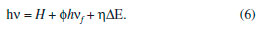 É importante ressaltar que em sistemas convencionais, esta taxa só pode ser medida depois de vários minutos, pela necessidade de se deixar acumular uma determinada densidade de O2. Enquanto que, usando a técnica fotoacústica, a evoluçao de O2 já é detectada logo no primeiro minuto. A PAS é uma técnica simples que permite obter espectros de absorçao nas regioes do ultravioleta ao infravermelho para uma grande variedade de materiais, tais como: sólidos, , líquidos, gases, pós, géis, filmes, entre outros, fornecendo tanto informaçoes qualitativas como quantitativas sobre o material analisado.34 A amostra é colocada dentro de uma célula vedada preenchida por gás, na qual um feixe de luzvindo do chopper incide sobre a amostra, através de uma janela transparente (célula fotoacústica fechada). No interior da célula encontra-se um microfone capacitivo que, na realidade é o detector. A energia da radiaçao modulada absorvida pela amostra é convertida em energia térmica, gerando flutuaçoes de pressao dentro da célula. Essas flutuaçoes sao detectadas pelo microfone que as converte em sinal elétrico que neste sistema é chamado de sinal fotoacústico (SPA).24 O sinal fotoacústico obtido é proporcional ao produto do espectro de emissao da luz incidente, I(ν) e pela energia dos fótons absorvidos, hn. Grande parte da energia incidente na folha é armazenada como energia química, sendo posteriormente utilizada na síntese de compostos necessários ao desenvolvimento da planta pela fotossíntese. Este armazenamento diminui a quantidade de luz absorvida que é transformada em calor. Assim, este efeito é chamado de perda fotoquímica, que pode ser descrita conforme Equaçao 6, relacionado ao balanço de energia do sistema vegetal sob incidência de luz.33 ![]() Como este produto difere para cada comprimento de onda, torna-se necessário normalizar os sinais medidos das amostras, pelo espectro da fonte de luz. Normalmente, para determinar este espectro, utiliza-se um carvao padrao. Os diferentes mecanismos, através dos quais os pulsos de calor produzidos na amostra geram ondas acústicas no gás, sao basicamente três: a difusao de calor da amostra para o gás, a expansao térmica da amostra e a flexao termoelástica da mesma. A ocorrência ou nao de um ou outro mecanismo e a predominância de um sobre o outro dependem das condiçoes experimentais, bem como do material a ser estudado.31,35 A expansao térmica pode ser entendida como o aquecimento periódico da amostra (devido aos pulsos de calor na amostra), acarretando uma oscilaçao da temperatura média. Como consequência, a amostra expande e contrai periodicamente, de forma que sua superfície em contato com o ar passa a funcionar como um pistao vibratório, gerando ondas acústicas no gás.31,35 A flexao termoelástica surge devido à existência de um gradiente de temperatura ao longo da espessura da amostra, pois a absorçao decresce à medida que a luz penetra no material.31,35 Este gradiente de temperatura faz com que a expansao térmica seja diferente para diferentes planos da amostra (perpendiculares ao gradiente), induzindo a uma flexao da mesma na direçao do gradiente, se suas bordas estiverem presas. Este processo é também periódico (semelhante à vibraçao da membrana de um tambor), gerando ondas acústicas no gás. Na difusao térmica, o pulso de calor produzido na amostra é transmitido ao gás, que ao expandir-se periodicamente, gera a onda acústica. As ondas acústicas também podem ser geradas a partir da variaçao do número de moléculas na câmera fotoacústica. Este é o caso das folhas vegetais, onde se tem o consumo do CO2 e a induçao do O2 durante a reaçao da fotossíntese. Uma vez que a luz incidente é modulada, tanto o consumo de CO2 quanto a induçao do O2 serao também modulados. Desde os primeiros estudos da aplicaçao da Espectroscopia Fotoacústica em folhas vegetais,36 muitos trabalhos sao feitos com pedaços da folha, isto é, tem que seccionar a folha para inserí-la dentro da célula fotoacústica. No entanto, o uso da técnica OPC permite que as medidas sejam feitas "in vivo", ou seja, diretamente com a folha na própria planta.37
