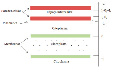 ![]() Figura 2. Seçao transversal esquemática de célula do mesófilo (Figura fora de escala). O cloroplasto tem espessura l1, o citoplasma l2, a parede celular l3 e o espaço intercelular l4,(despreza-se a espessura das membranas celulares. Adaptaçao Barja19)