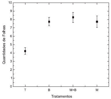 ![]() Figura 4. Quantidades das folhas em plantas de mamoeiros aos 120 dias de cultivo em solos com: testemunha (T), B (Biochar), M+B (Micorriza e Biochar) e M (Micorriza)