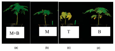 ![]() Figura 5. Fotografias das mudas de mamao cultivadas por 120 dias: a) mamoeiro cultivado em solo tratado com micorriza e biochar (M+B); b) cultivado em solo tratado com adiçao de micorriza (M); c) mamoeiro cultivado em solo sem tratamento (T); d) mamoeiro cultivado em solo tratado com biochar (B)