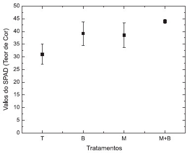 ![]() Figura 6. Valores médios da leitura do SPAD (intensidade de cor verde) em folhas de plantas de mamao cultivado por 120 dias com os tratamentos T (testemunha), B (Biochar), M+B (Micorriza e Biochar), M (Micorriza)