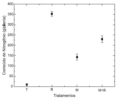 A análise foliar, que é uma das técnicas utilizadas para a avaliaçao do estado nutricional das plantas, possibilita verificar a ocorrência de deficiências, toxidez ou desequilíbrio de nutrientes. No conteúdo de Nitrogênio foi observado menor valor no controle e maior no tratamento M, M + B e B. Segundo Silva et al.,43 o nitrogênio é considerado um dos nutrientes com maiores incrementos na produtividade do mamoeiro. Cruz et al.,44 relatam que o mamoeiro sob deficiência de nitrogênio pode acarretar na reduçao do crescimento e alteraçao na massa seca. Para a variedade Golden, todos os parâmetros de crescimento das plântulas do mamoeiro podem ser prejudicados pela deficiência de nitrogênio, sendo a área foliar o componente mais afetado.45 O conteúdo de nutrientes, analisado na Figura 7, retrata a quantidade do elemento que foi acumulado na planta. No presente experimento o FMA aumentou em torno de 1050% a aquisiçao do Nitrogênio, no entanto o FMA + Biochar aumentou a aquisiçao de Nitrogênio e em torno de 2164% em relaçao à testemunha e só a aplicaçao do biochar apresentou em aumento atual de 3374% também em relaçao à testemunha. O maior acréscimo no conteúdo de Nitrogênio no tratamento com biochar ocorreu, provavelmente porque somente a planta utilizou o nitrogênio e já no tratamento com FMA e FMA + Biochar, as micorrizas também utilizaram o nitrogênio, reduzindo, assim, no conteúdo na planta. Apesar disso, na leitura do SPAD (intensidade de cor verde) os valores nao diferiram (Figura 6) entre os tratamentos M + B, M e B, confirmando o aspecto visual observado na Figura 5, onde somente as plantas do controle estao amareladas.