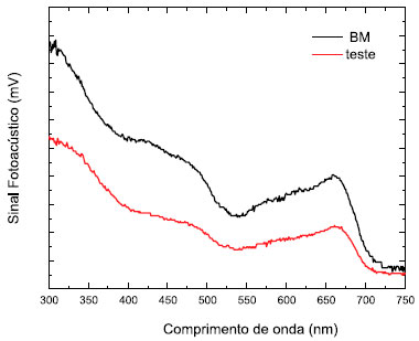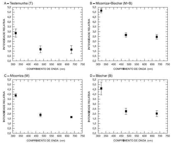 As relaçoes simbióticas mutualísticas das micorrizas com as raízes das plantas sao associaçoes que propiciam a absorçao de nutrientes.46 No entanto, os microrganismos também requerem os nutrientes para seu metabolismo. O baixo conteúdo do nitrogênio na testemunha (Figura 7) provavelmente acarretou a clorose visível nas folhas (Figura 5C) que foram também identificados pelo menor valor na intensidade de cor verde avaliada pelo SPAD (Figura 6). Torres Netto et al.,40 correlacionaram a leitura do SPAD ao teor de clorofila e também aos teores de Nitrogênio. Análise fotoacústica em folhas de mamao em funçao de diferentes manejos Foram obtidos os espectros das folhas de mamoeiros cultivados em solos tratados com FMA, com biochar, com biochar + micorrizas e em plantas nao submetidas a tratamentos (testemunha). Para qualificar a eficiência da aplicaçao do biochar e das micorrizas, foram avaliados os espectros de duas folhas de mamoeiro (Figura 8) cultivadas no solo tratado com M + B e em ausência desses componentes (T). Os picos de absorçao concordam com os comprimentos de onda típicos da espectroscopia de absorçao no visível de folhas, isto é, por volta de 320, 480 e 680 nm que representam a cutícula, (a cera que protege a folha contra agentes externos), o pico mais dominante da clorofila b e o pico mais dominante da clorofila a, respectivamente.47 Como ilustrados na Figura 8, nota-se uma maior absorçao por parte da cutícula e das clorofilas a e b no espectro para otratamento M + B, demonstrando a eficiência desse tratamento, apresentando, ainda, um reforço na cutícula das folhas.