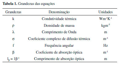 Assim, opticamente, podemos classificar as amostras comparando a sua espessura ls com o seu comprimento de absorçao óptica lβ: Se ls >> lβ → amostra opticamente opaca. Se ls ≅ lβ → amostra absorvedora. Se ls < lβ → amostra opticamente transparente. Termicamente, a classificaçao é feita através da comparaçao entre a espessura da amostra ls e a profundidade que alcança o calor dentro da amostra, definido como comprimento de difusao térmica, µs: Se ls < µs → amostra termicamente fina. Se ls > µs → amostra termicamente grossa. A quantidade de radiaçao transformada em calor fica relacionada diretamente com as propriedades de absorçao, difusao e espessura da amostra absorvedora da radiaçao, que é baseada na Equaçao 2: ![]() onde, ![]() Aqui,