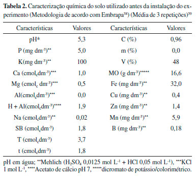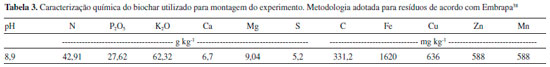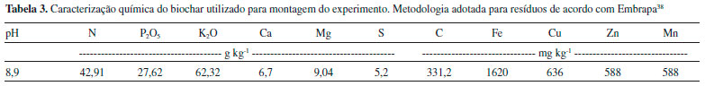 O biochar foi produzido a partir da pirólise de cama de aviário a uma temperatura de 400 ºC, sendo homogeneizado antes da deposiçao nos vasos. O biochar apresentou 267 g dm3 de densidade aparente e a caracteristica química de acordo com a Tabela 3. O biochar foi aplicado no solo a 1% V/V correspondendo a 2,7 g dm3 de solo.