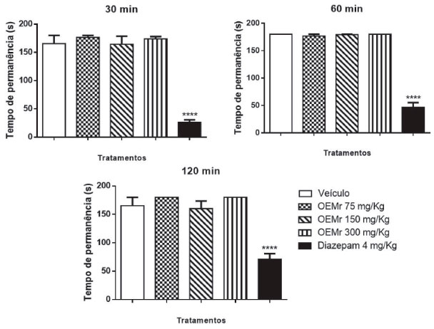 Figura 1. Efeito do óleo essencial de Myrcia rostrata na coordenaçao motora dos camundongos aos 30, 60 e 120 min após a administraçao das substâncias. Resultados expressos como média ± e.p.m. **** p<0,0001 indica diferença significativa quando comparado ao grupo controle. (ANOVA seguido de Dunnett, n = 8 por grupo)