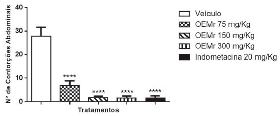 ![]() Figura 2. Efeito do óleo essencial de Myrcia rostrata no teste das contorçoes abdominais induzidas pelo ácido acético. Resultados expressos como média ± e.p.m. **** p<0,0001 e comparados com o grupo controle. (ANOVA seguido de Dunnett)