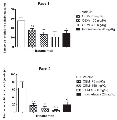 ![]() Figura 3. Efeito do óleo essencial de Myrcia rostrata no teste da formalina. Resultados expressos como média ± e.p.m. ns = nao significativo; ** p<0,01; *** p<0,001. (ANOVA seguido de Dunnett)