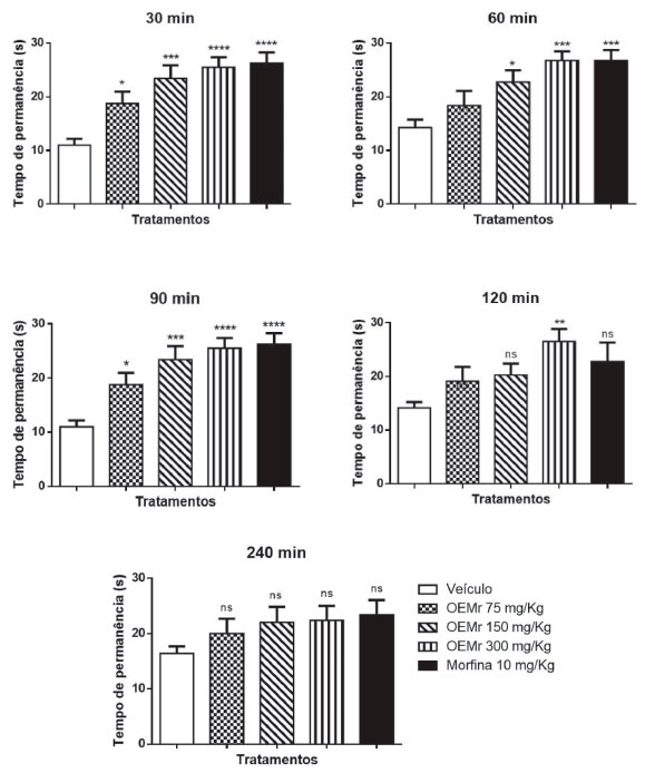 Figura 4. Efeito do óleo essencial de Myrcia rostrata no teste da placa quente avaliado aos 30, 60, 90, 120 e 240 min após a administraçao das substâncias. Resultados expressos como média ± e.p.m e comparados com o grupo controle. ns = nao significativo; * p<0,05; ** p<0,01; *** p<0,001; **** p<0,0001. (ANOVA seguido de Dunnett)