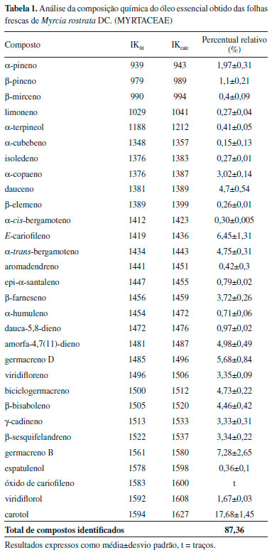 RESULTADOS E DISCUSSAO Análise do óleo essencial O óleo essencial de M. rostrata apresentou um rendimento de 0,42% (m/v), mais do que o dobro do obtido (0,2%) a partir das folhas frescas dessa mesma espécie coletadas em populaçoes nativas do Rio Grande do Sul.25 A análise da composiçao química revelou que do total dos constituintes químicos identificados (87,62%); 4,76% corresponderam a monoterpenos e 95,24% a sesquiterpenos. Dentre estes últimos, destacaram-se o dauceno (4,7%), germacreno D (5,68%), E-cariofileno (6,45%) e o germacreno B (7,28%), sendo o carotol (17,68%), o composto majoritário (Tabela 1). Esta composiçao química difere da descrita para o óleo essencial da espécie nativa do Rio Grande do Sul, com 93,3% de sesquiterpenos, tendo a-cadinol (4,6%), d-cadineno (5,7%) e óxido de cariofileno (13,1%) como constituintes majoritários,25 assim a populaçao oriunda da Bahia pode se tratar de um novo quimiotipo de M. rostrata.