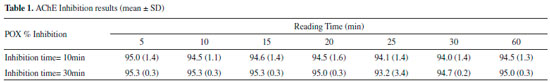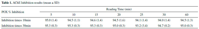 RESULTS AND DISCUSSION General comments In carrying out the Ellman's assays, special care should be taken with the toxicity of the employed inhibitors, as organophosphorus compounds are poisonous. Cholinesterases extraction from biological sources18,19 may be an alternative to commercial sources in budget-tight laboratories. Stability of enzyme stock solutions must be considered, as well as the effect on cholinesterases by solvents in assayed compounds' solutions. Background effects on absorbance must also be considered for plates and compound solutions, avoiding calculating errors and invalid data. Such effects are relevant in measurements of Cholinesterase activity in tissue and blood samples in routine diagnosis.5,6,9,10,19-21 Interference caused by thiol residues found in these matrices requires different approaches for its minimization, such as sample dilution or previous treatment of biological matrix with DTNB.5,6,10 Hemoglobin absorbance at 412nm could also be a potential source of error, which might require the use of a different wavelength or development of novel chromophores.9,10,21-23 BChE simultaneous reaction might also be a limitation to this methodology. Washing with saline solution or the use of specific BChE inhibitors, such as ethopropazine are possible solutions.9,10 Inhibition of cholinesterase Cholinesterase inhibition may be calculated using the following equation, %I= [(L0 - Li)/L0]x100, being %I the inhibition percent, L0 the absorbance without inhibitor and Li the absorbance with inhibitor. Results after AChE inhibition for 10 and 30 minutes using POX 11 µmol L-1 are shown in Table 1. POX concentration was defined according to the literature,11 although higher concentrations might be used. Nevertheless, as organophosphorus compounds (as POX) are potent cholinesterase inhibitors, it is important to avoid concentrations that may pose unnecessary hazard to the operator. Usually, papers have described organophosphorus concentrations ranging from 10-5 to 10-9 mol L-1.8,11-13 One can check the suitable inhibition level by performing the assay with different inhibitor concentrations, keeping in mind not to fully inhibit the enzyme. Residual AChE activity avoids misinterpretation of reactivation data due to reactions between test chemicals and excess of inhibitor, for example. According to our tabulated data (Table 1), inhibition by POX, a potent cholinesterase inhibitor, was immediate, keeping steady over time. However, we decided to use 10 min as inhibition time in this case. It is noteworthy that inhibition reaction time, level and concentration are customable by the operator. This makes the procedure herein presented, used in our research on novel antidote candidates against different organophosphorus compounds, easily adjustable.