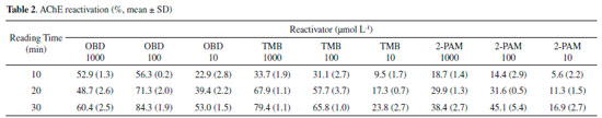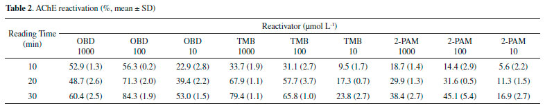 pH is important as it may interfere in enzyme activity, as we have noted in our trials (data not shown). All experiments must be performed at the same pH. Literature recommends pH values close to physiological pH, usually varying between 7.4-7.8, the optimal pH range for the enzyme.7-15 In our procedures, we set it at 7.60 ± 0.10. We also identified that isopropanol and DMSO (used as solvents in solutions of assay chemicals) interfered on enzyme activity, if at high concentrations. In fact, in our conditions, we detected enzyme inhibition and conflicting measurements for concentrations higher than 10% for isopropanol and 5% for DMSO (data not shown). Due to these observations, we decided to use PBS both as negative control and for dilutions of antidotes (or test compounds), which led to consistent results. Reactivation of cholinesterase Cholinesterase reactivation may be calculated by using the following equation, %R= [(Lr-Li)/(L0-Li)]x100, being %R the reactivation percent, L0 the absorbance without inhibitor, Li the absorbance with inhibitor and Lr the absorbance after addition of reactivator. After 10 min-inhibition with 11 µmol L-1 of POX, the enzyme reactivation were effected by standard antidotes obidoxime dichloride (OBD), trimedoxime dibromide (TMB) and pralidoxime iodide (2-PAM) as shown in Table 2.