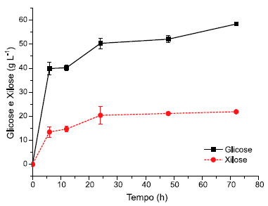Huang et al.23 também determinaram as propriedades físico-químicas das fibras das cascas do abacaxi como um ingrediente potencial. Os autores mostraram que os principais açúcares presentes na biomassa seca eram glicose e xilose, afirmando ainda que os resíduos do abacaxi sao formados majoritariamente por celulose. Considerando o balanço de massa referente a caracterizaçao química da biomassa, é possível constatar que apenas 68,32% da composiçao do material lignocelulósico de Ananas comosus foi determinada. Possivelmente, a porcentagem de 31,68% esteja relacionada com outros componentes estruturais, como proteínas, lipídeos e outros açúcares nao quantificados nesse estudo. Com o objetivo de introduzir um novo processo para produçao de etanol, Pourbarani et al.24 registraram também a composiçao química do resíduo de laranja, demonstrando que esse substrato cítrico continha em sua composiçao 22% de celulose, 11,09% de hemicelulose e 2,19% de lignina. Comparando a composiçao estrutural desse resíduo com o de Ananas comosus, pode-se afirmar que a porcentagem dos complexos poliméricos (celulose e hemicelulose) foi bem próxima a dos resultados descritos neste estudo. Contudo, uma expressiva diferença para a fraçao lignina, provavelmente, por ser um dos principais constituintes da planta, sendo responsável pela sua resistência,25 característica encontrada nas folhas de Ananas comosus, que compoe a coroa. Outra possível explicaçao pode estar relacionada com sua menor solubilidade o que faz com que esse polímero nao seja facilmente digerido. Hidrólise enzimática da coroa de Ananas comosus Na Figura 1 é mostrada a biotransformaçao da biomassa lignocelulósica através da hidrólise enzimática. Após quantificaçao em HPLC, 58,44 e 21,91 g L-1 de glicose e xilose, respectivamente, foram alcançados.