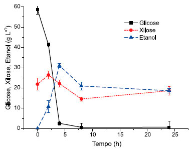 Os resultados obtidos nesse estudo afirmam, portanto, que a hidrólise da coroa de Ananas comosus, utilizada como substrato, teve impacto positivo no metabolismo enzimático para a produçao de açúcares fermentescíveis. Além disso, é possível deduzir que a atividade enzimática teve crescimento exponencial à medida que o tempo de hidrólise enzimática prosseguia, mostrando que esse processo resultou em diminuiçao das fibras de biomassa e um aumento concomitante dos açúcares solúveis, porém, com menor taxa de liberaçao para xilose. Para os carboidratos totais quantificados nesse estudo (Tabela 1), o teor de glicose foi 37,47% maior no licor sacarificado em relaçao à liberaçao de xilose, o que pode representar uma hidrólise mais eficiente para conversao de celulose em glicose, visto que o complexo enzimático utilizado caracteriza-se por conter em sua formulaçao celulases. Além disso, esses resultados foram obtidos com uma carga enzimática de 20 FPU/g de biomassa, sugerindo, portanto, ser um dado potencial para aplicaçao futura de novos ensaios de hidrólise enzimática com diferentes cargas de sólidos e enzima, assim como, testes de hidrólise combinada empregando-se celulases e hemicelulases na mesma reaçao. Por outro lado, ainda que a condiçao de hidrólise tenha sido favorável à celulose, a concentraçao de xilose alcançada (21,91 g L-1) mostrou-se bastante significativa, levando-se a considerar a importância do uso de leveduras recombinantes, capazes de fermentar simultaneamente glicose e xilose, visando uma produçao de etanol mais atrativa. Segundo Tropea et al.,26 essa alternativa de uso de microrganismos melhorados geneticamente pode valorizar as concentraçoes e a produtividade finais de etanol, uma vez que as pentoses (majoritariamente xilose) poderiam ser também fermentadas a partir do licor sacarificado. Ainda sobre a reduçao de açúcares da biomassa da coroa de Ananas comosus, Boonwong et al.27 investigaram o seu potencial para produçao de açúcares por via enzimática. Após o pré-tratamento da biomassa empregando o ácido sulfúrico como catalisador da reaçao para desestruturar as fibras da coroa do abacaxi, os autores empregaram a enzima cellulase (Cellic®CTec2) na etapa de hidrólise enzimática obtendo-se 113,70 g L-1 de açúcares redutor. No entanto, esses resultados apontam fragilidades no que se refere a quantificaçao específica dos diferentes carboidratos presentes nas fraçoes celulose e hemicelulose da biomassa, uma vez que nao houve, por exemplo, distinçao das hexoses e pentoses. A fermentaçao dos açúcares redutores totais com a cepa de Saccharomyces cerevisiae TISTR 5596 alcançou a produçao máxima de 33,58 g L-1 de etanol, demonstrando que os resíduos da coroa do abacaxi podem ser um material adequado para produçao de etanol. Fermentaçao do licor hidrolisado de Ananas comosus Na Figura 2 é mostrado o curso da produçao de etanol bem como o consumo dos açúcares presentes na biomassa. A taxa de utilizaçao de açúcares pela levedura Saccharomyces cerevisiae JAY-270 nas quatro primeiras horas foi relativamente alta e a produçao de etanol apresentou considerável declínio após 5 horas de fermentaçao. A produçao de etanol foi de 18,80 g L-1 em 24 horas, porém, seu mais alto grau foi obtido após as primeiras 4 horas de fermentaçao alcançando 31,10 g L-1 de etanol. A produçao de etanol a partir dos resíduos das folhas de Ananas comosus foi investigada por Chintagunta et al.28 em um estudo descrito na literatura e, para isto, utilizaram-se estratégias de hidrólise enzimática e fermentaçao simultânea. Os autores alcançaram produçao de etanol de 7,12% (v/v) em 24 horas de fermentaçao, o que reforça a valorizaçao dos resíduos das folhas de Ananas comosus obtidos dos setores agrícola e agroindustrial.