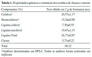 RESULTADOS E DISCUSSAO Caracterizaçao química A composiçao química média da coroa de Ananas comosus nao tratada aplicada neste estudo é apresentada na Tabela 1.