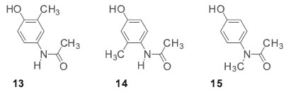 Entretanto, o composto 12 reagiu com água e anilina, levando à substituiçao do carbono da imina, gerando 2,6-dimetil-p-benzoquinona e 3,5-dimetil-N-fenil-p-benzoquinona-imina, enquanto que o etanotiol formou o composto 3,5-dimetil-2-tioetil-4-hidroxi-acetanilida, através de reaçao de Michael. Estes resultados diferem muito do esperado e proposto na literatura, deixando algumas dúvidas, se nao foram encontradas as condiçoes reacionais ou se a reatividade molecular da NAPQI pode ser alterada pelo efeito estéreo-eletrônico das duas metilas. A hepatotoxicidade e a nefrotoxicidade foram avaliadas através do grau de necrose celular usando ratos e camundongos. As doses foram administradas pelas vias intraperitoneal (IP) e intragástrica (IG). Os compostos 3 e 5 substituídos apresentaram maior toxidade em doses crescentes, seguido pelos derivados 2 e 6 substituídos, comparados ao paracetamol (1) e o N-metil-paracetamol (15).81 Homólogos metilados Derivados monometilados do PAR propostos por Nelson et al49 mostraram uma diminuiçao, tanto da atividade analgésica, quanto do potencial citotóxico, quando comparados ao paracetamol 1 e ao 3-metilparacetamol 13, demonstrando que estas atividades estao diretamente relacionadas, sendo observado também que o composto 2-metilparacetamol 14 possui atividade muito menor e que o N-metilparacetamol 15 é praticamente inativo, observados pelos valores de dose efetiva (DE50) na Figura 7 e na Tabela 1. A toxicidade está de acordo com a prova de funçao hepática, medida pelos níveis de transaminase.70
