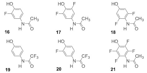 Análogos fluorados A hepatotoxicidade e açao analgésica de seis análogos fluorados do paracetamol, compostos de 16-21, mostrados na Figura 8, foram avaliadas em ratos. Apesar da baixa atividade analgésica dos demais compostos, o candidato 20 foi 3,5 vezes mais ativo com menor potencial tóxico que o paracetamol. O potencial de oxidaçao dos compostos 19 e 20 foram os mais altos. Após o estudo da relaçao estrutura e atividade nenhum destes compostos avançou para a fase clínica.68