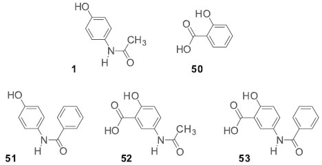 Associaçao molecular p-aminofenol e salicilatos Em um esforço para desenvolver derivados de salicilatos como antioxidantes, nosso grupo utilizou o farmacóforo antioxidante do paracetamol 1 em uma associaçao molecular com o ácido salicílico 50, que pertencem a classe dos anti-inflamatórios nao esteróides, bem como pela substituiçao do grupo acetamida por benzamida. Três derivados desta associaçao entre p-aminofenol e salicilatos foram sintetizados e sua atividade antioxidante avaliada e comparada com aos seus genitores e o trolox. A estratégia sintética geral empregada para preparar os compostos alvos foi baseada na acilaçao ou benzoilaçao do p-aminofenol ou ácido 5-amino-salicílico com cloreto do benzoíla ou anidrido acético, formando o p-benzamidafenol 51, ácido 5-acetilamido-2-hidroxibenzóico 52 e ácido 5-benzamido-2-hidroxibenzóico 53, respectivamente, com rendimento 80-90% (Figura 12). Os dados de RMN de H1 e C13 foram usados para determinar a estrutura dos produtos derivados da reaçao.90