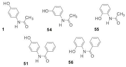 Foi realizado estudo teórico do metabolismo do ácido salicílico usando cálculos de química quântica pela teoria do funcional de densidade no nível B3LYP, com a base 6-31G*, empregada para obter a energia, o potencial de ionizaçao e a distribuiçao da densidade de spin do ácido salicílico comparando com seus derivados, fenol e ácido benzóico. Os resultados confirmam a geraçao regiosseletiva do ácido 2,5-dihidroxibenzóico pelo CP450 e ácido 2,3-dihidroxibenzóico e catecol como derivados da reaçao seqüestrantes da atividade antioxidante.91 Além disso, as atividades antioxidantes dos compostos foram comparadas com o potencial de ionizaçao e o HOMO, calculados usando métodos TDF, para explorar a relaçao estrutura-atividade. Todos os cálculos foram executados usando os pacotes computacionais Gaussian 03, Hyperchem 7.5 e ChemOffice 2005. A atividade antioxidante foi determinada pela medida da inibiçao dos níveis de TBARS na peroxidaçao lipídica em eritrócitos humanos iniciadas por Fe2+ e ácido ascórbico, peróxido de hidrogênio e AAPH. Suas atividades seqüestrante de radicais livres foram avaliadas também, usando um radical livre estável, 1,1-difenil-2-picrilhidrazil (DPPH). O composto substituído pelo grupamento benzoíla (51) exibiu uma inibiçao mais potente do que o paracetamol, enquanto que os derivados da associaçao molecular (52 e 53) exibiram uma inibiçao mais potente do que o ácido salicilico. Os parâmetros moleculares relacionados à distribuiçao de eletrônica e estrutural, tais como potencial de ionizaçao (PI) e orbital molecular ocupado de mais alta energia (HOMO), apresentaram uma boa correlaçao com a açao antioxidante.92 Nos modelos de nocicepçao e inflamaçao o composto 52 apresentou inibiçao significante e dose-dependente com as doses utilizadas (10, 5 e 2,5 mg kg-1) nos testes de contorçao abdominal e formalina na fase 2, edema de pata e de orelha, bem como ausência de mortes na toxicidade oral aguda com as doses máximas permitidas para esse teste (2000 e 5000 mg kg-1). Esse composto apresenta atividade antinociceptiva de origem inflamatória, sem envolvimento de receptores opióides, atividade anti-inflamatória e antiedematogênica, classificado como agente xenóbióticos de baixa toxicidade. Este efeito pode ser devido à presença do grupo carboxilato polar, que altera as propriedades de ADMETox (absorçao, distribuiçao, metabolismo, excreçao e toxicidade) do paracetamol.93 Regioisômeros Outro planejamento molecular realizado por nosso grupo foi baseado na estrutura do ligante usando métodos de química quântica no nível DFT para regioisômeros do paracetamol como candidatos a fármacos analgésicos (Figura 13). Os descritores moleculares HOMO, PI, energia de dissociaçao da ligaçao fenólica (EDLOH) e distribuiçao da densidade de spin foram relacionados com a reatividade química do radical tirosil, um grupo reativo presente no sitio ativo da ciclo-oxigenase, bem como pela formaçao de moléculas do tipo N-acetil-benzoquinona imina através da abstraçao de elétron ou hidrogênio, as quais sao responsáveis pela toxicidade do paracetamol.94