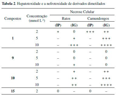 Estes resultados mostram que estas duas atividades podem ser dependentes da formaçao do intermediário p-benzoquinona-imina (NAPQI). De fato, sem uma reaçao de N-desmetilaçao no derivado N-metil (15), ele nao pode formar o intermediário tipo quinona-inina, o que explicaria sua baixa atividade. Todavia, os derivados 3-metil (13) e 2- metil (14) devem formar quinona-imina, mas a posiçao do grupamento metila pode diferir a reatividade química desses compostos quando comparados com o PAR. Adicionalmente, os resultados de necrose celular apresentados na Tabela 2 confirmam que para compostos dimetilados admistrados seja pela via intraperitoneal (IP) ou intragástrica (IG), o derivado substituído na posiçao 2,6 (9) apresenta menor citotoxidade quando comparado ao seu isômero posicional 3,5 (10) e o PAR (1), devido a algum tipo de impedimento estérico durante o processo de metabolismo para a formaçao de derivados NAPQI.