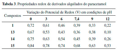 Além disso, a capacidade redox pode explicar a capacidade de formar o intermediário reativo NAPQI e a atividade analgésica dos derivados, usando voltametria cíclica em diferentes condiçoes de pH. Os valores demonstraram uma relaçao direta da potência citotóxica e atividade analgésica com o potencial de oxidaçao, sendo que os mais baixos valores sao mais ativos, expostos na Tabela 3. No entanto, eles nao explicam a diferença na toxicidade, reafirmando assim a importância do efeito estérico na produçao de quinona-iminas.