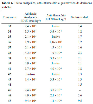 Substituiçoes de grupos elétron doadores (-CH3, -OCH3 e -SCH3) nas posiçoes 3,5 decrescem o potencial de ionizaçao, aumentam a inibiçao da ciclo-oxigenase e diminuem a toxicidade, enquanto que com grupos elétron atraentes (-F, -Cl, -Br e -I) diminuem a atividade biológica, mas reduzem a toxicidade discretamente.69 Bessems e colaboradores15 estudaram este grupo de compostos pelo método ab initio e demonstraram que a saída do hidrogênio ligado ao grupo fenol é muito mais favorecida do que o a saída do hidrogênio ligado ao nitrogênio do grupo amida em 125 kJ mol-1, sendo confirmada experimentalmente por meio do espectro de ESR (Espectro de Ressonância de Spin). Estes valores foram confirmados pelo método DFT.85,86 Derivados acil-etér-alquílico Derivados com substituiçoes duplas foram concebidas visando desenvolver moléculas com atividade anti-inflamatória, uma vez que o paracetamol nao possui essa propriedade terapêutica. A síntese foi baseada na estrutura química do paracetamol, tendo em vista a elevada gastrotoxicidade da aspirina. As alteraçoes nas funçoes acetamida e fenol, gerando os derivados acil-etér ilustrados na Figura 10. Os compostos exibiram maiores atividades analgésicas e antinflamatórias quando comparados com a aspirina. Adicionalmente, das treze combinaçoes, onze demonstraram possuir atividade analgésica 2-10 vezes comparado à potência da aspirina 47. Além disso, todas as combinaçoes mostraram baixíssima gastrotoxicidade quando comparadas à aspirina,87 resultados mostrados na Tabela 6.